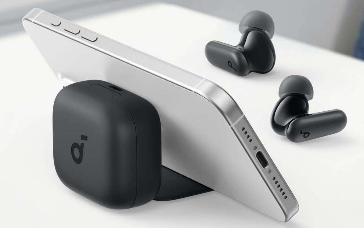Беспроводные наушники с функцией активного шумоподавления и чехлом-подставкой для смартфона.