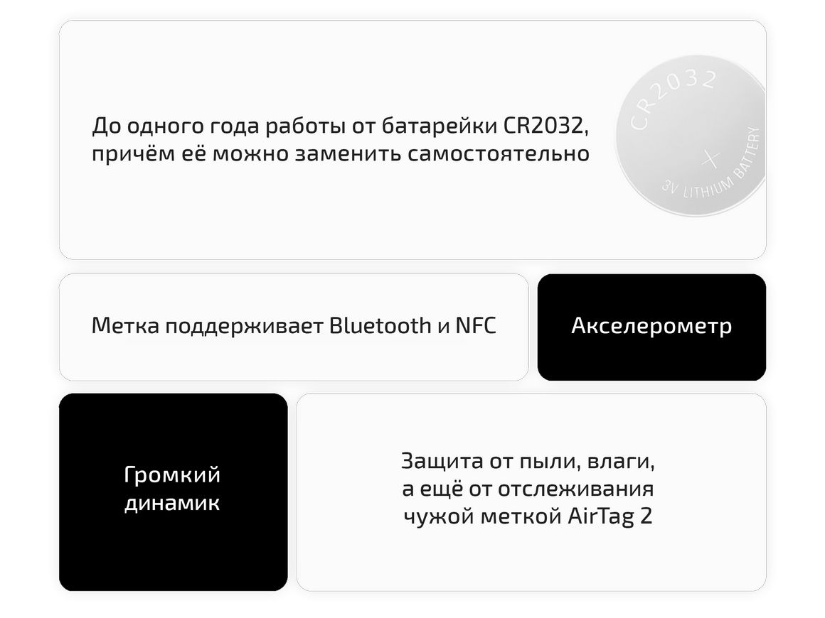 Питание AirTag 2-го поколения тоже не претерпело изменений. Здесь используется плоская батарейка типоразмера CR2032, которой хватает в среднем на год работы за счёт небольшого энергопотребления гаджета. Когда батарейку придёт пора менять, функционал метки будет ограничен, а вы получите уведомление на iPhone или iPad (информация о батарейке также будет отображаться в приложении «Локатор»). Кстати, AirTag поставляется готовой к работе – батарейка уже вставлена, а подключить и настроить беспроводную метку так же просто, как AirPods.