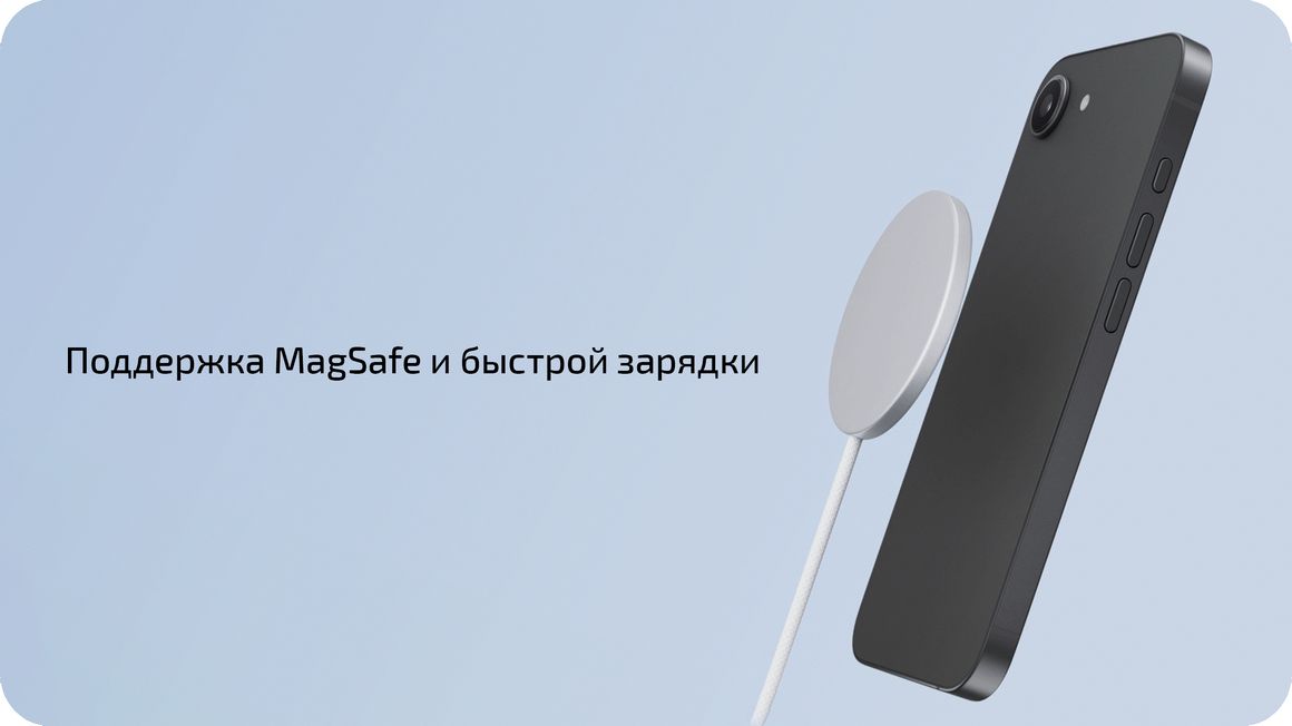 Чехол с магнитами больше не обязательное условие для использования картхолдеров, держателей и других аксессуаров MagSafe. А ещё скорость беспроводной зарядки стала выше, а при подключении зарядных устройств с MagSafe на экране будет соответствующая анимация. Помимо этого iPhone 17e оснащён разъёмом USB-C для зарядки и передачи данных. При использовании адаптера питания мощностью 20 Вт смартфон способен зарядиться примерно до половины всего за полчаса. В комплект входит кабель USB-C в износостойкой оплётке. Ёмкий аккумулятор обеспечивает до 26 часов в режиме воспроизведения видео.