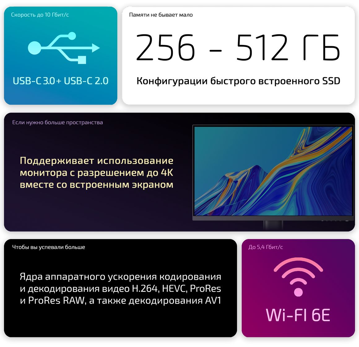 Ноутбук получил яркий глянцевый экран Liquid Retina, быстрый SSD-накопитель, поддержку актуальных беспроводных стандартов, качественные динамики и большой трекпад, а ещё приятный алюминиевый корпус, доступный в нескольких расцветках, часть из которых впервые дебютировала именно в данной модели. Если вы давно хотели купить розовый макбук или лимонно-жёлтый, чтобы он был лёгким, удобным и не заставлял носить с собой зарядку и искать розетку в кафе, на лекции или в коворкинге – это тот самый ноутбук, который ещё и весит всего 1,23 кг, а его толщина в сложенном виде – 1,27 см.