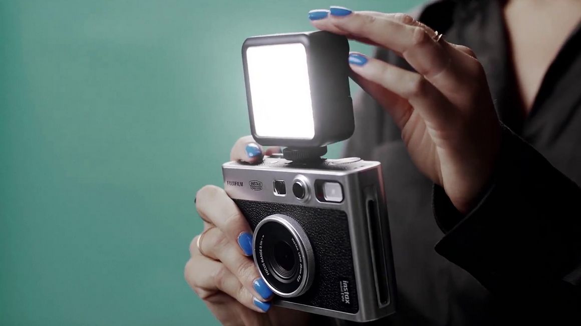 FUJIFILM instax mini EVO сразу привлекает внимание своим внешним видом: он выполнен в ретро-стиле со вставками из искусственной кожи, напоминающем классические плёночные камеры. Устройство оборудовано башмаком для аксессуаров — сюда можно установить светодиодный осветитель. Также на корпусе предусмотрено резьбовое гнездо для крепления на штативе или другом держателе.