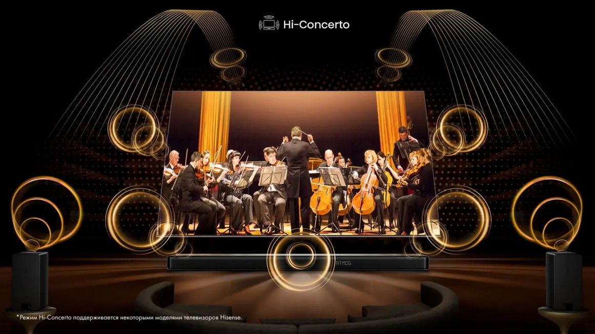 C помощью встроенной в телевизор Hisense ИИ-технологии оптимизируйте звук в соответствии с особенностями планировки. Индивидуальное звучание достигается за счет плавной адаптации к пространству и точности воспроизведения.