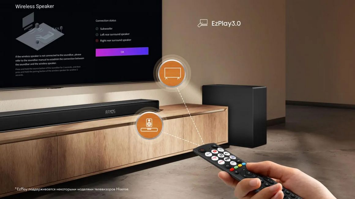 Легко меняйте режимы саундбара с помощью пульта от телевизора Hisense, чтобы оптимизировать диалоги и музыкальное сопровождение. Благодаря EzPlay 3.0 на экране ТВ в реальном времени отображается статус беспроводного динамика, значительно упрощая управление.
