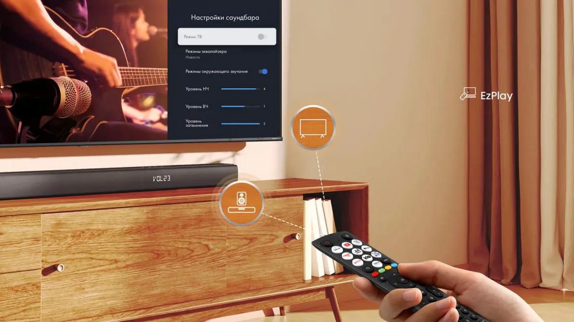 Меню настроек саундбара Hisense отображается на экране ТВ, поэтому управлять его звучанием легко получится при помощи пульта от телевизора Hisense.
