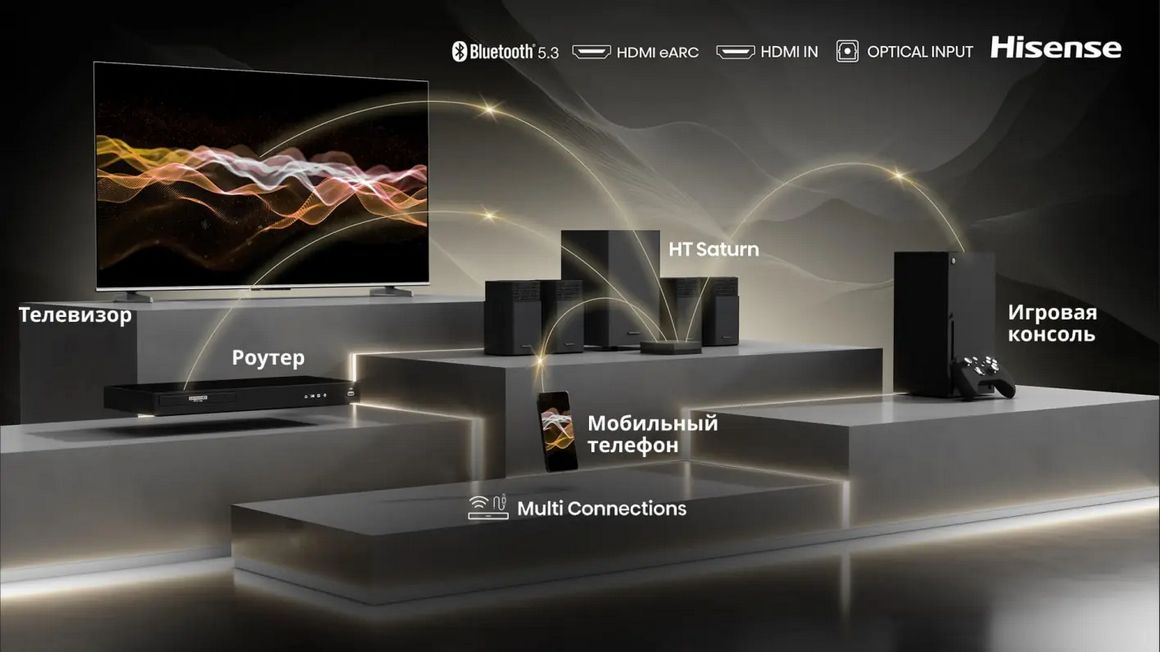 Наслаждайтесь улучшенным объемным звучанием при совместной работе телевизора и HT Saturn. За счет одновременного использования всех имеющихся динамиков значительно расширяется звуковое поле и достигается поистине обволакивающий акустический эффект.
