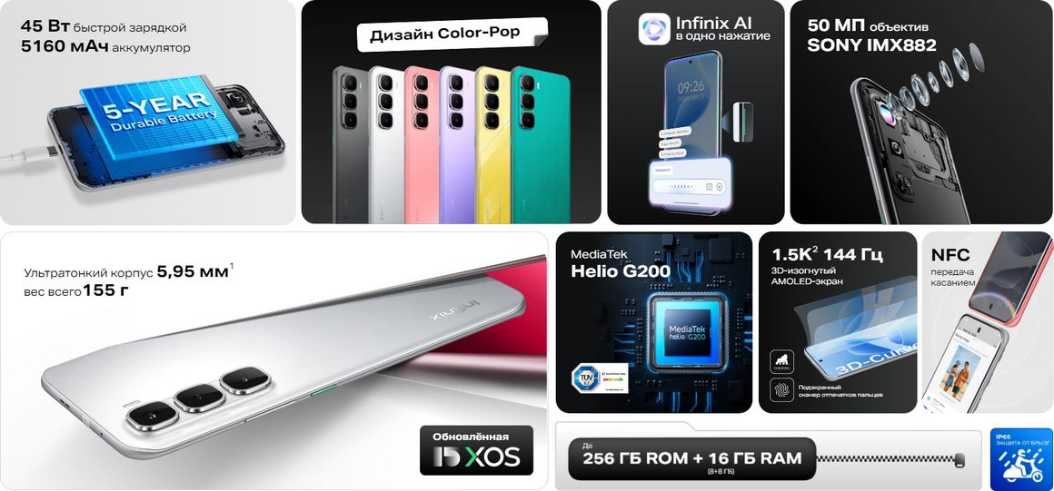 Infinix HOT 60 Pro+ официально признан самым тонким смартфоном с изогнутым экраном: толщина корпуса в самой узкой точке составляет всего 5,95 мм, а вес — 155 г, что делает устройство чрезвычайно легким и удобным для удержания в руке. При этом в тонком корпусе разместилась мощная батарея емкостью 5160 мА·ч с поддержкой быстрой зарядки на 45 Вт.