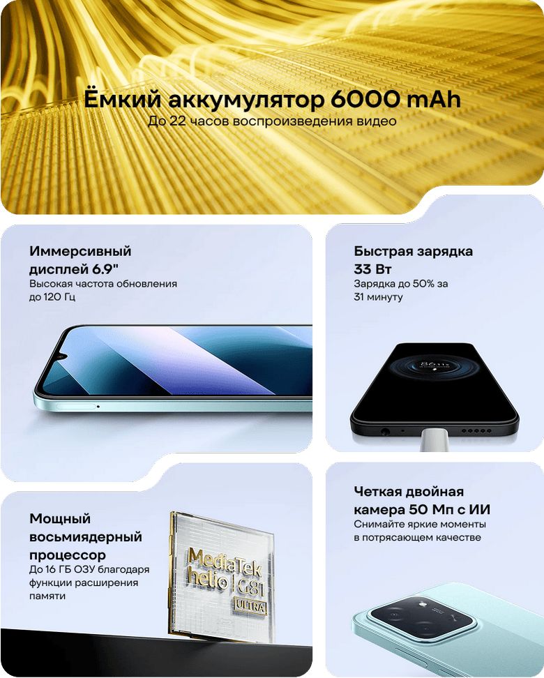 POCO C85 - это смартфон, который сочетает в себе вневременной дизайн, большой 6.9-дюймовый дисплей с частотой обновления 120 Гц и чрезвычайно мощный аккумулятор емкостью 6000 mAh. Благодаря восьмиядерному процессору MediaTek Helio G81 Ultra вы получите плавную производительность для повседневного использования, игр и многозадачности, а быстрая зарядка 33 Вт сэкономит ваше драгоценное время. Защита от пыли и брызг воды по стандарту IP64 гарантирует, что телефон не подведет вас даже в самых сложных условиях. С помощью двойной 50-мегапиксельной камеры с искусственным интеллектом вы сможете запечатлеть каждый момент в ярких цветах и с четкими деталями - будь то портреты, ночные снимки или селфи.