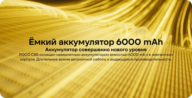 POCO C85 скрывает в своем тонком корпусе аккумулятор емкостью 6000 mAh, который обеспечит вам энергию на более чем два дня обычного использования. Смотрите ли вы видео, слушаете музыку, читаете или звоните по телефону, вы можете рассчитывать на исключительную автономность без необходимости частой зарядки. Телефон POCO C85 поддерживает быструю зарядку 33 Вт, которая позволяет за 31 минуту зарядить аккумулятор до 50% емкости. Благодаря этой функции вам не нужно беспокоиться даже в напряженные дни - короткая пауза позволит зарядить устройство на несколько часов использования.