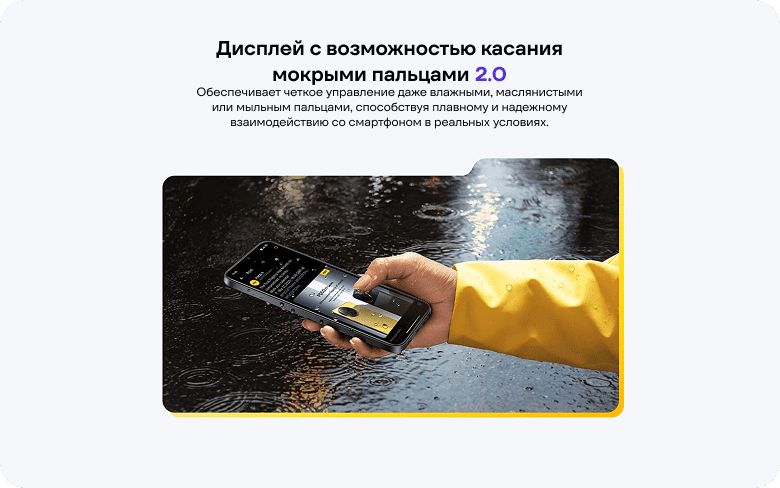 Специальная технология Wet Touch 2.0 позволяет управлять дисплеем, даже если ваши пальцы мокрые, от масла или пены. Таким образом, телефон точно реагирует на каждое прикосновение даже в более сложных условиях - например, во время дождя, после занятий спортом или во время приготовления пищи. Благодаря этому мобильный телефон POCO C85 дает вам уверенность, что дисплей всегда будет полностью функциональным, независимо от окружающих условий.