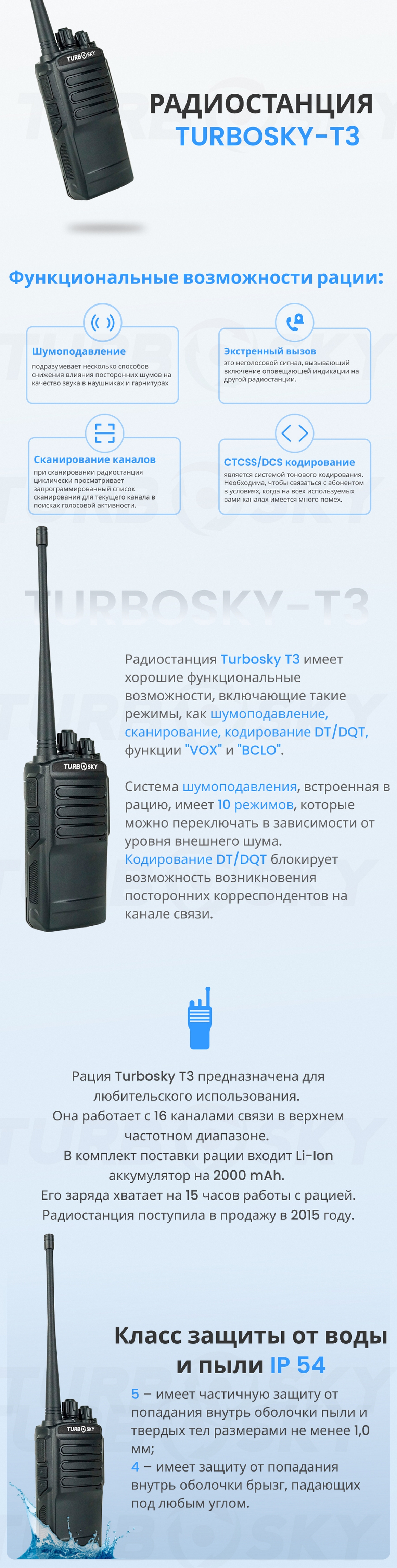 Рация Turbosky T3 предназначена для любительского использования. Она работает с 16 каналами связи в верхнем частотном диапазоне. В комплект поставки рации входит Li-Ion аккумулятор на 2000 mAh. Его заряда хватает на 15 часов работы с рацией. Радиостанция поступила в продажу в 2015 году.