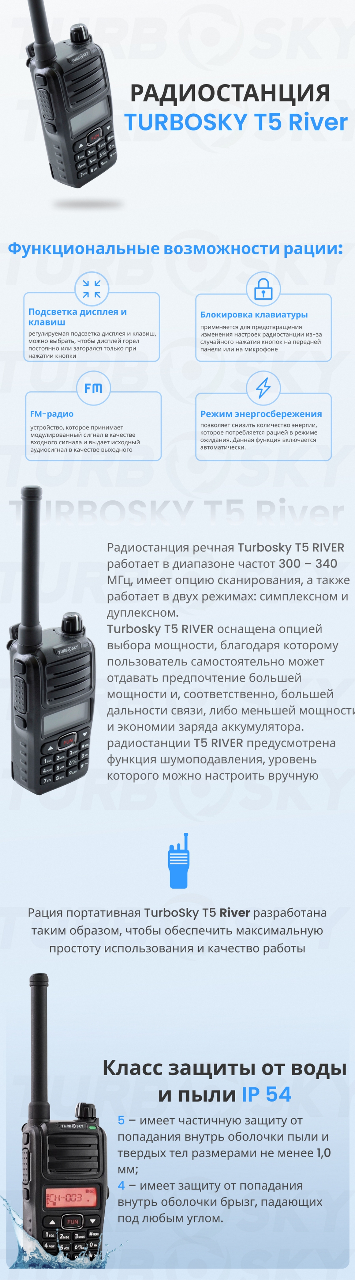 Turbosky T5 RIVER оснащена опцией выбора мощности, благодаря которому пользователь самостоятельно может отдавать предпочтение большей мощности и, соответственно, большей дальности связи, либо меньшей мощности и экономии заряда аккумулятора.