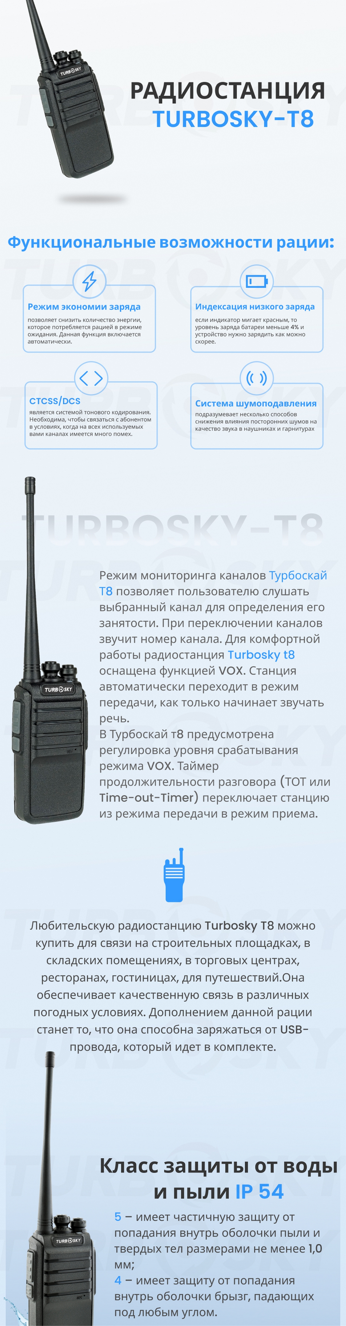 Любительскую радиостанцию Turbosky T8 можно купить для связи на строительных площадках, в складских помещениях, в торговых центрах, ресторанах, гостиницах, для путешествий.Она обеспечивает качественную связь в различных погодных условиях. Дополнением данной рации станет то, что она способна заряжаться от USB-провода, который идет в комплекте.