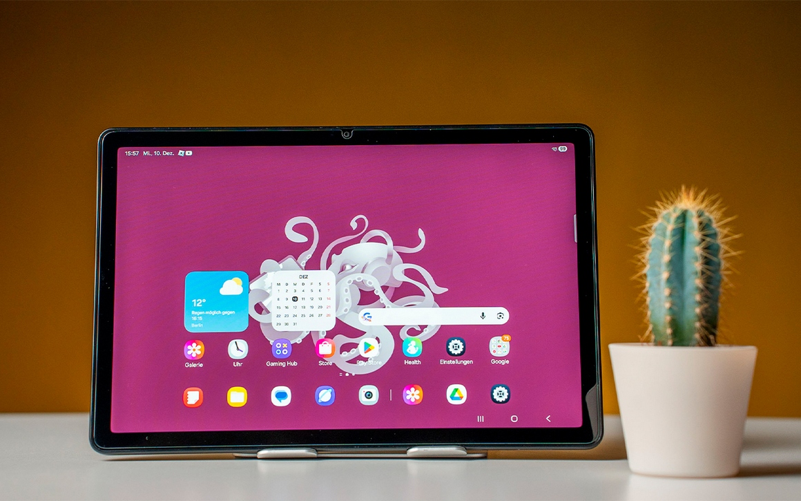 Главная вещь в планшете – это конечно экран. Galaxy Tab A11+ получил 11-дюймовый дисплей с разрешением 1920 x 1200 пикселей. Благодаря частоте обновления в 90 Гц прокрутка страниц и анимации интерфейса выглядят очень плавными. Яркости экрана более чем достаточно для помещений, а вот для работы под прямыми солнечными лучами на улице запас всё же маловат. Но часто ли мы выносим планшет на улицу? Экран защищён закалённым стеклом, а сам корпус девайса изготовлен из высококачественного алюминия. Благодаря толщине 6,9 мм планшет удобно держать одной рукой.
