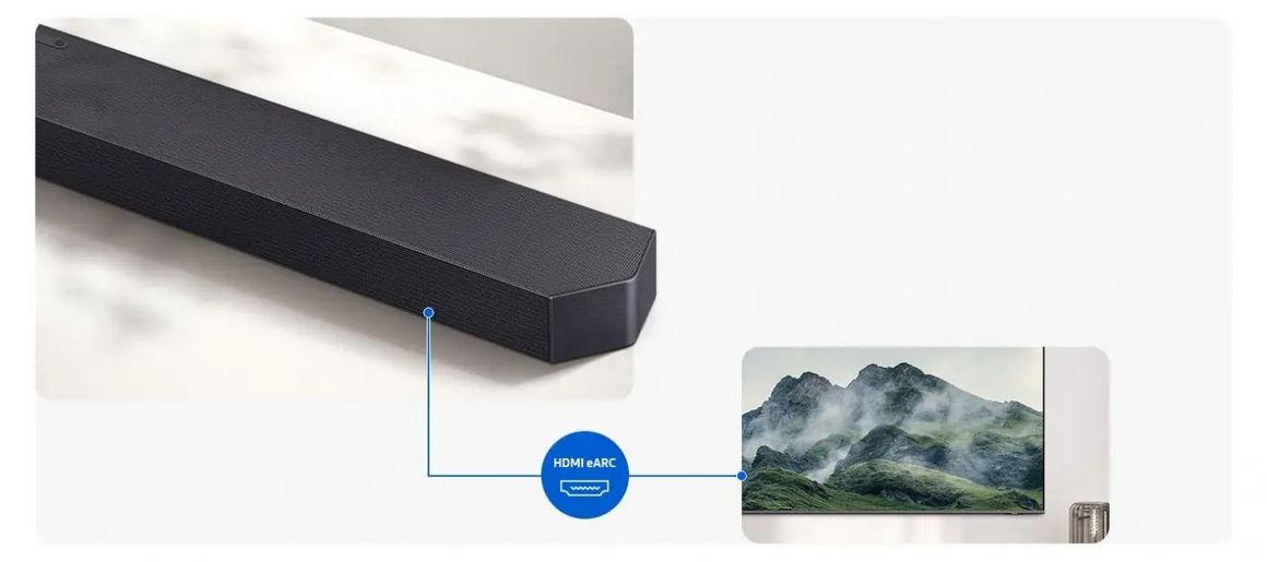 Ваш саундбар поддерживает HDMI eARC - всё что надо для передачи звука высочайшего качества с вашего телевизора и подключенных к нему устройств. Наслаждайтесь высочайшим качеством объемного звука в таких форматах, как Dolby Atmos.