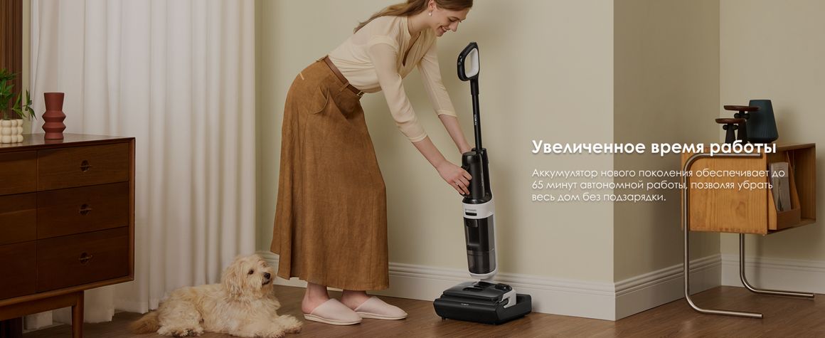 Благодаря мощному аккумулятору, моющий пылесос вертикальный обеспечивает продолжительную и высококачественную уборку до 65 минут без необходимости перезаряжать батарею.