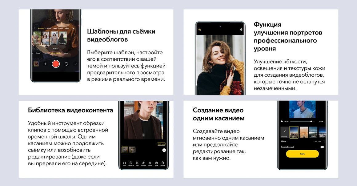 Режимы и функции фотосъемки: Высокое разрешение, Пано, Документы, Slo-mo, Time-lapse, Supermoon, Astro, Pro, Snapshot, Food, Live Photo, Night, Portrait, Photo, Video, Micro Movie, Dual View