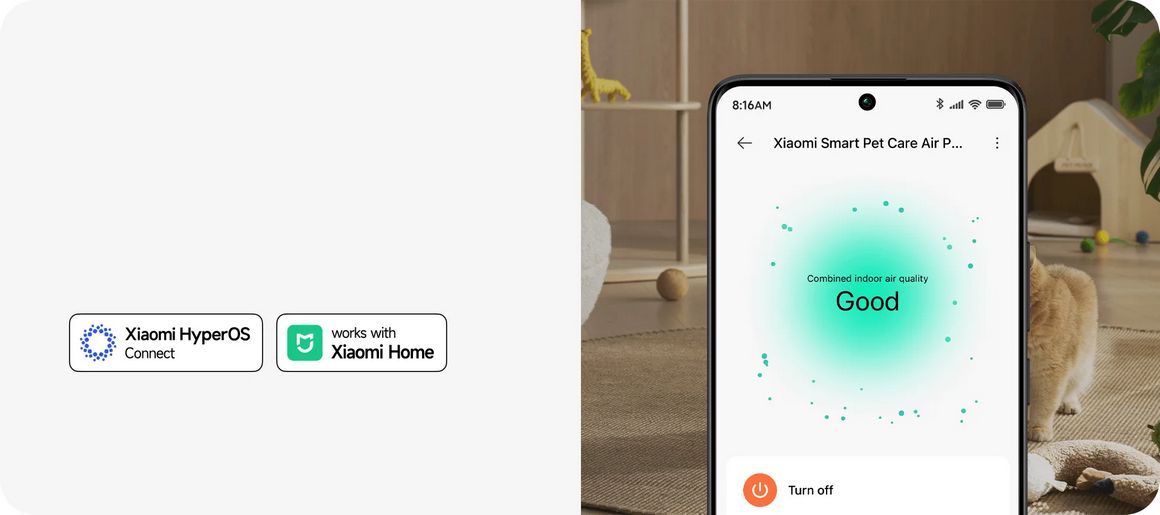 Специальный алгоритм, разработанный Xiaomi, автоматически регулирует скорость очистки постепенно в зависимости от качества воздуха, обеспечивая быстрое очищение воздуха и уменьшая резкие изменения воздушного потока, которые могут напугать домашнего питомца.