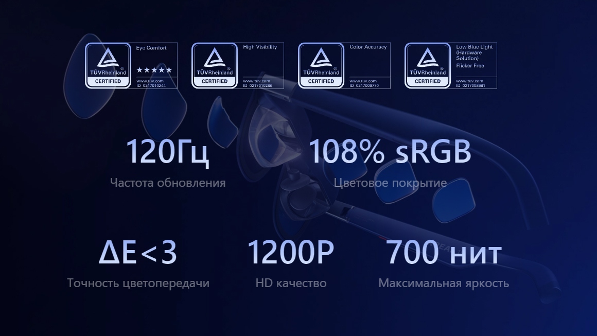 XREAL 1S оснащены двумя микро-дисплеями, которые создают эффект огромного виртуального экрана — до 500 дюймов по диагонали, с углом обзора 52°.