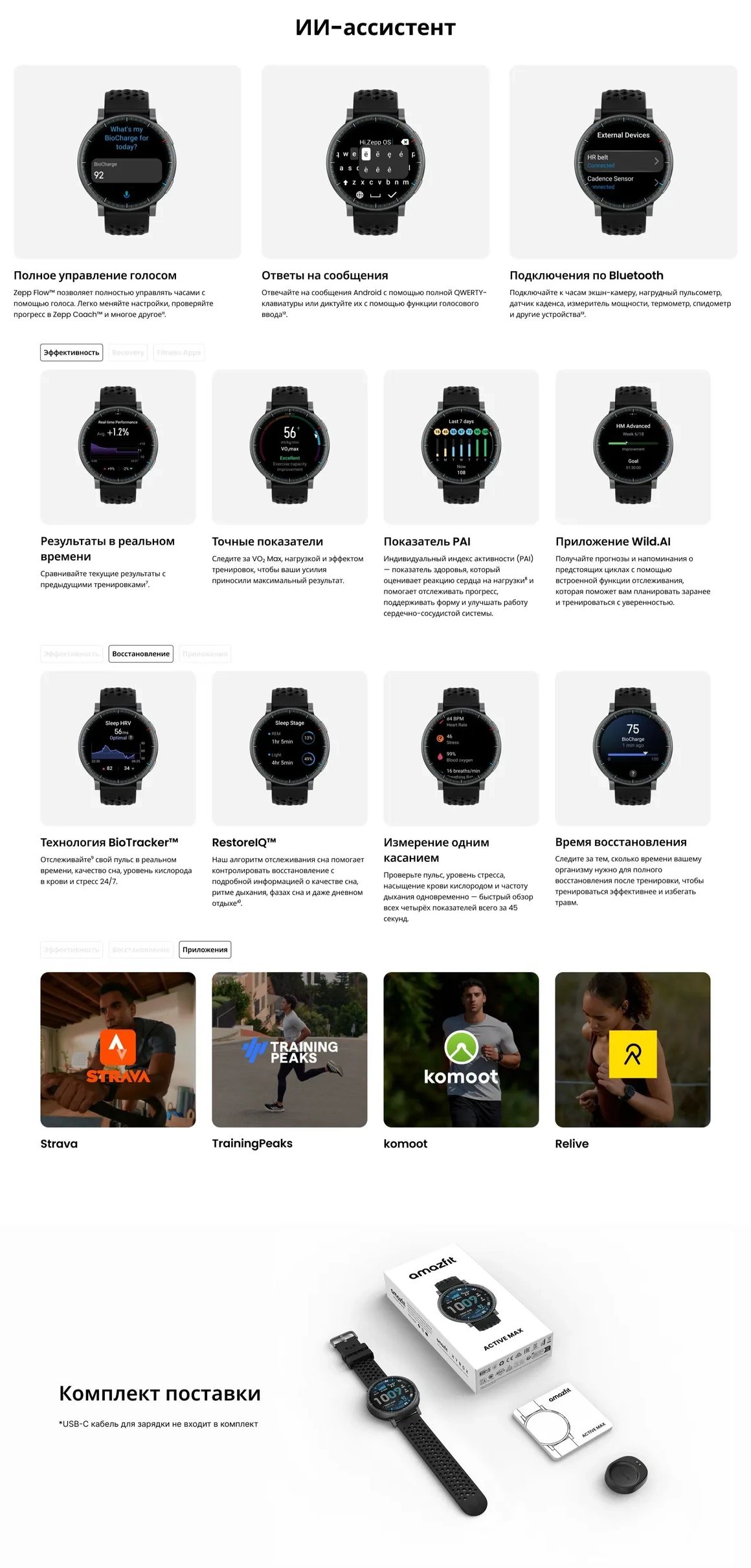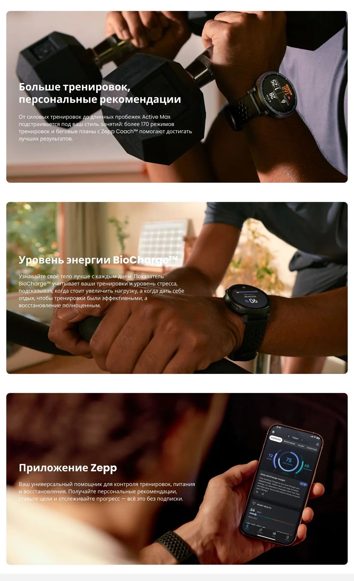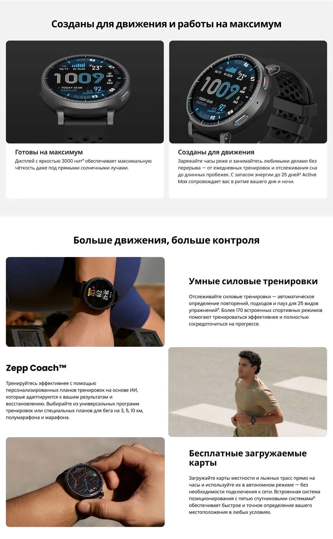 С большим 1,5-дюймовым AMOLED-дисплеем, 4 ГБ памяти для до 100 часов подкастов и офлайн-карт, функцией мониторинга энергии BioCharge и персональными планами Zepp Coach часы дают всё, что нужно для тренировок и активного образа жизни. Удобные, лёгкие и готовые к любым задачам, они помогают поддерживать регулярность занятий и гармонично вписываются в повседневный ритм.