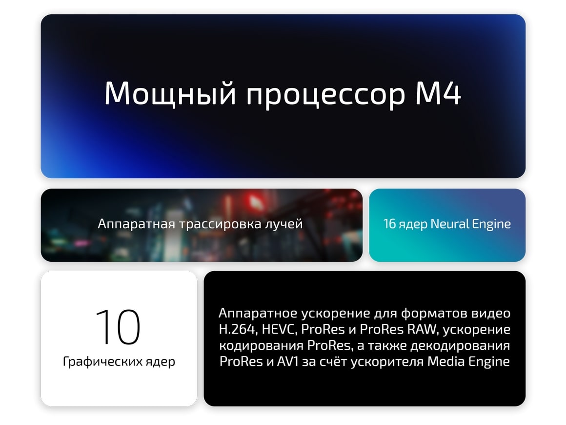Вся линейка iMac 2024 работает на мощных процессорах Apple M4, которые стали гораздо производительнее предыдущих чипов Apple Silicon, поэтому даже апгрейд с модельного ряда iMac на M1 теперь оправдан, не говоря о моноблоках с процессорами Intel. 10-ядерный M4 позволяет с комфортом использовать ресурсоёмкие программы, будь то пакеты для монтажа видео, среды разработки или сложные графические проекты. Он также унаследовал 16-ядерный аппаратный ускоритель машинного обучения для работы с нейросетями и их разработки и поддерживает аппаратное ускорение популярных форматов видео при монтаже.