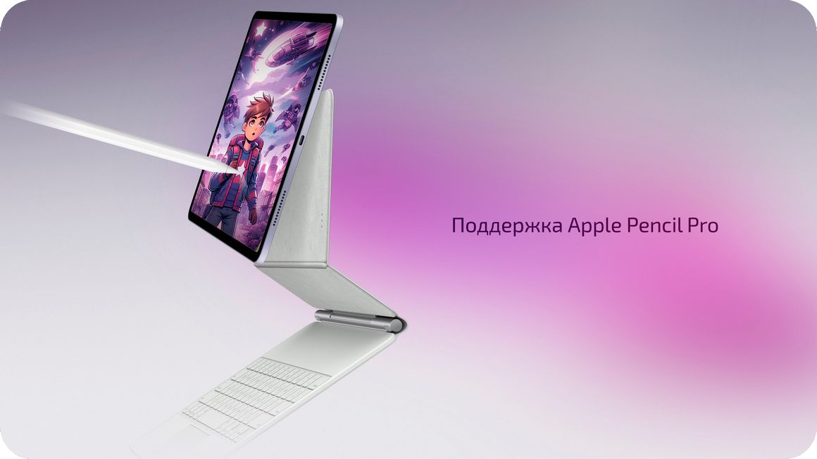 iPad Air поддерживает Apple Pencil Pro и Apple Pencil USB-C, которые превращают планшет в удобный инструмент для рисования, заметок и работы с графикой. Перо распознаёт силу нажатия и наклон, позволяя создавать более точные линии и штрихи. Технология определения положения стилуса над экраном помогает удобнее работать с инструментами редактирования и кистями в графических приложениях. При использовании Apple Pencil Pro доступна как магнитная зарядка, так и все его возможности, включая наведение (Hover). Также планшет имеет контактный порт Smart Connector для подключения клавиатур Apple без проводов.