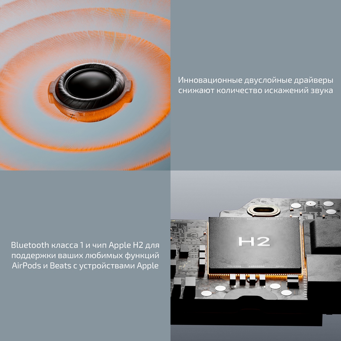 Помимо качественной передачи речи и активного шумоподавления, система из нескольких микрофонов и голосовых акселерометров используется в адаптивном эквалайзере, который оптимизирует звучание, анализируя форму ваших ушей.