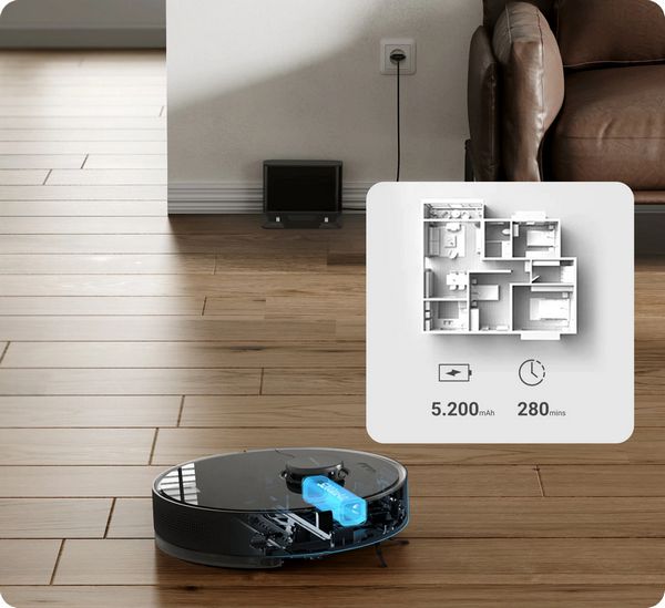 Аккумулятор емкостью 5200 мАч обеспечивает до 280 минут* непрерывной уборки. Когда заряд батареи заканчивается, робот автоматически возвращается к станции, а затем возвращается к работе с того места, на котором остановился.
