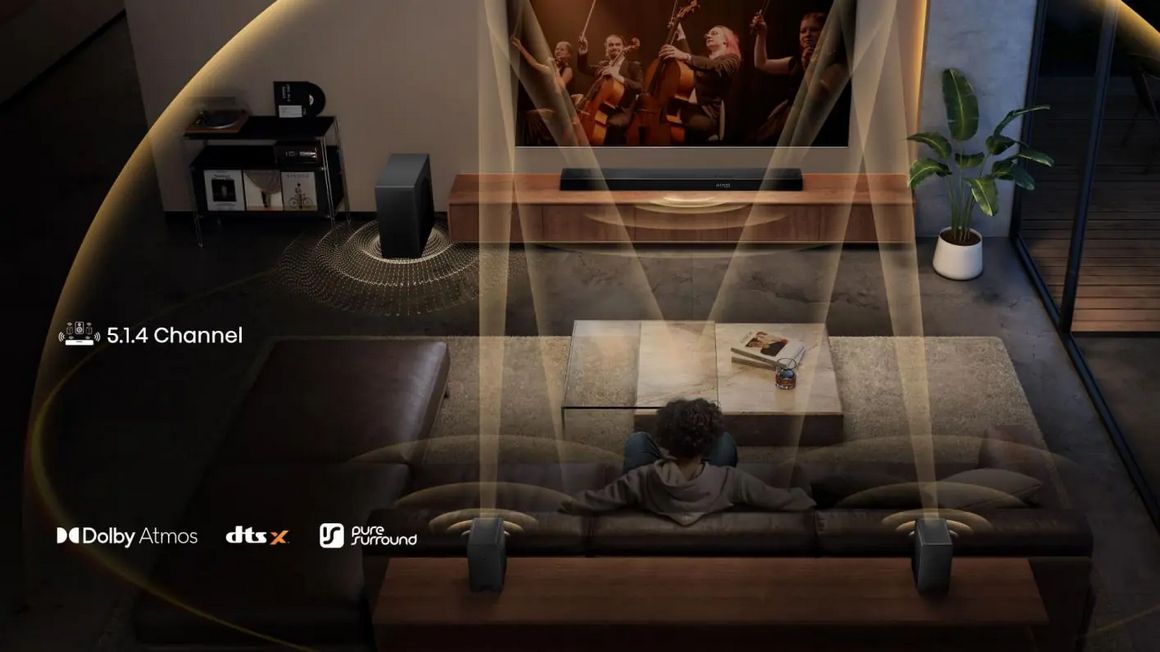 Погрузитесь в 5.1.4-канальный звук с поддержкой технологий Dolby Atmos и DTS:X. Четыре направленных вверх динамика формируют звуковой оазис с охватом в 360°, окружающий слушателей со всех сторон.