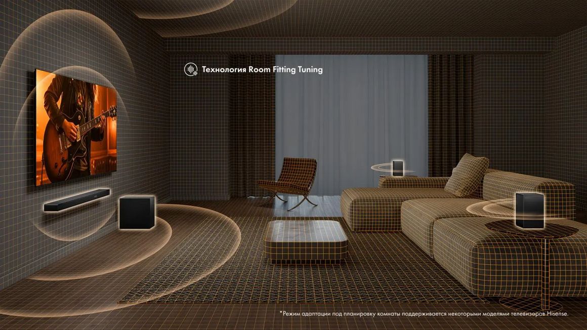 C помощью встроенной в телевизор Hisense ИИ-технологии оптимизируйте звук в соответствии с особенностями планировки. Индивидуальное звучание достигается за счет плавной адаптации к пространству и точности воспроизведения.