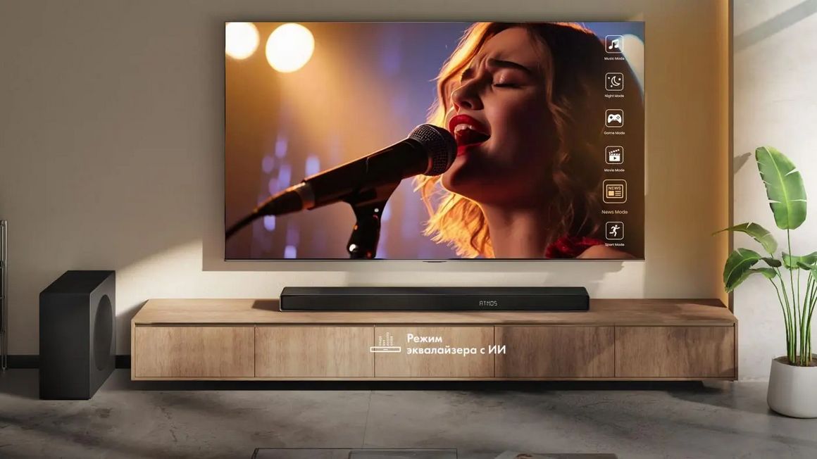 Режим эквалайзера AI EQ Mode, работающий на основе передовых ИИ-алгоритмов, устраняет искажения, повышает четкость и формирует захватывающие звуковые ландшафты для каждого сюжета.