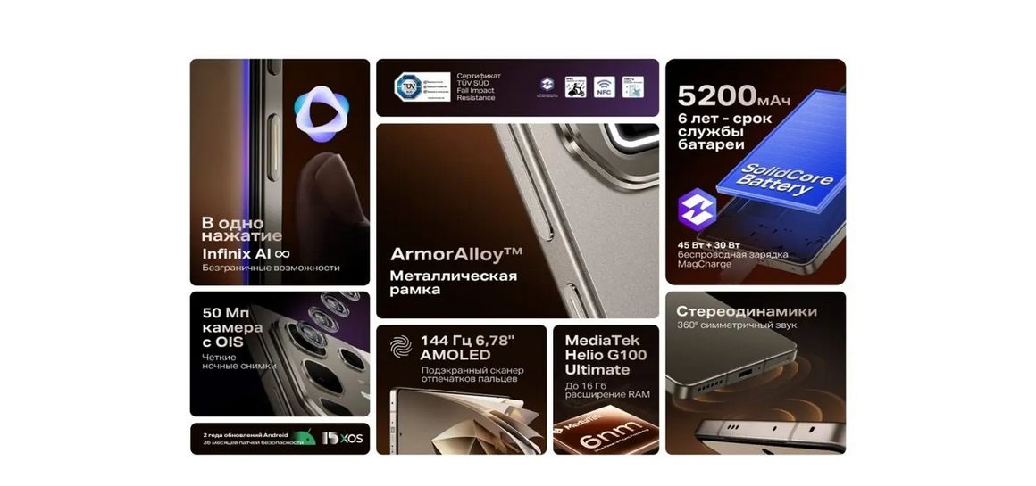 Смартфон Infinix NOTE 50 – это идеальное сочетание стиля, надежности и высоких технологий. 6.78-дюймовый 144 Гц AMOLED экран демонстрирует сочную и плавную картинку, а процессор MediaTek Helio G100 в сочетании с 8 ГБ оперативной памяти обеспечивает уверенную производительность в любых сценариях.