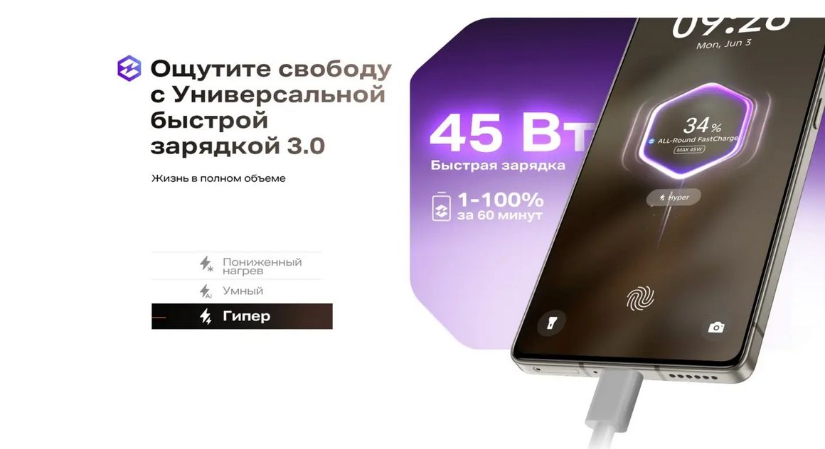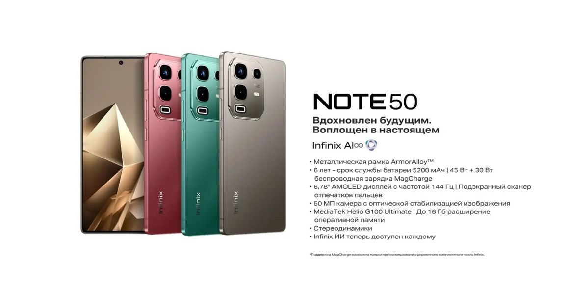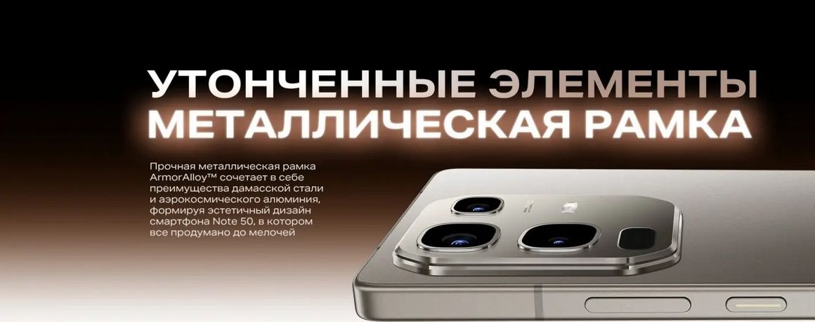 Устройство поставляется с быстрой зарядкой мощностью 45 Вт и блоком беспроводной зарядки на 30 Вт. Металлические корпус и рамка NOTE 50 гарантируют долговечность и устойчивость к ударам, сохраняя при этом легкость устройства благодаря технологии HyperCasting, применяемой в производстве автомобилей премиум-класса.