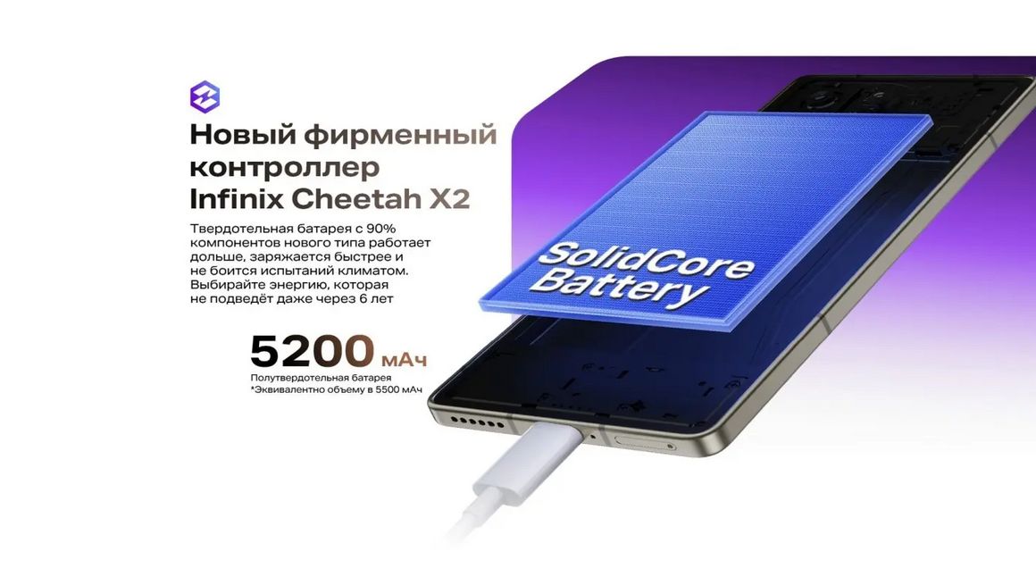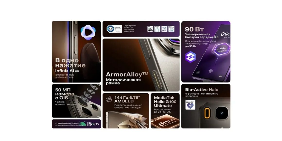 Смартфон Infinix NOTE 50 Pro – это стильное и высокотехнологичное решение на каждый день. 6.78-дюймовый 144 Гц AMOLED экран демонстрирует сочную и плавную картинку, а процессор MediaTek Helio G100 в сочетании с 12 ГБ оперативной памяти обеспечивает уверенную производительность в любых сценариях. Устройство поставляется с быстрой зарядкой мощностью 90 Вт и блоком беспроводной зарядки на 30 Вт. Металлические корпус и рамка NOTE 50 Pro гарантируют долговечность и устойчивость к ударам, сохраняя при этом легкость устройства благодаря технологии HyperCasting, применяемой в производстве автомобилей премиум-класса. За качественные фотографии в смартфоне отвечает основная камера на 50 Мп с оптической стабилизацией изображения, а для пейзажных снимков есть 112° ультраширокоугольный 8 Мп объектив.