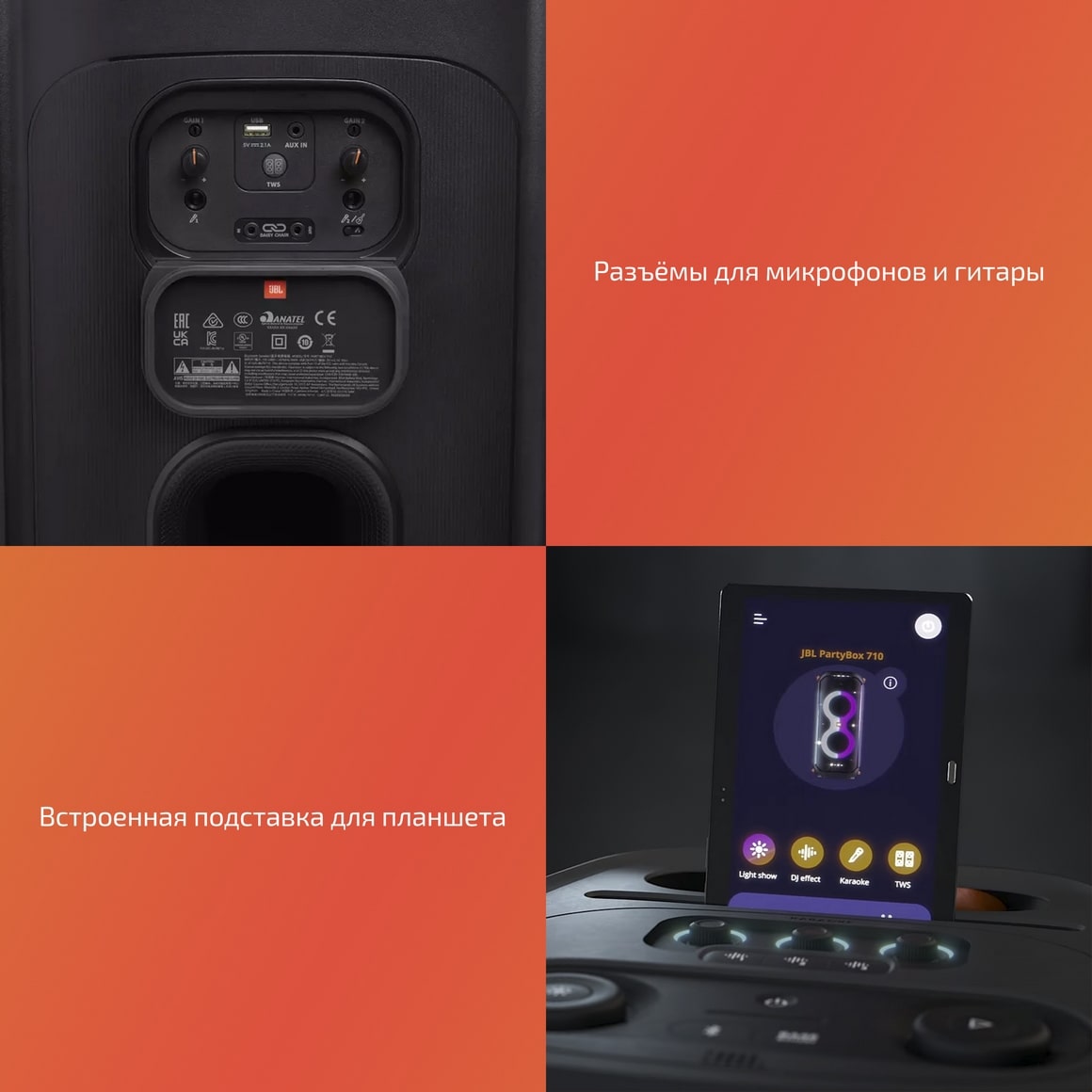 Музыкальная Midi-система JBL Partybox 710 разработана специально для организации зажигательных вечеринок. Она не только порадует гостей отличным звуком, но и впечатлит ярким и динамичным цветовым шоу. Синхронизация с треками и возможность индивидуальной настройки позволят создать уникальную атмосферу, присущую только вашему празднику. Вводите нужные параметры и шаблоны через приложение PartyBox.