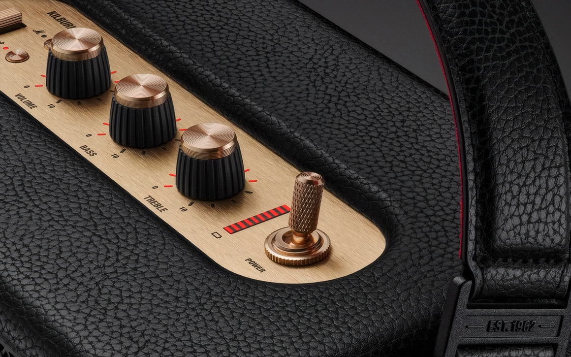 В наше время трудно найти гаджет с аналоговыми элементами управления. В Marshall Kilburn III они присутствуют. На верхней части колонки расположены классические ручки для настройки громкости, баса и высоких частот. Так же есть физический переключатель воспроизведения и стильный тумблер включения и выключения устройства. Такой подход к управлению колонкой не только интуитивно понятен, но и добавляет особого шарма устройству.