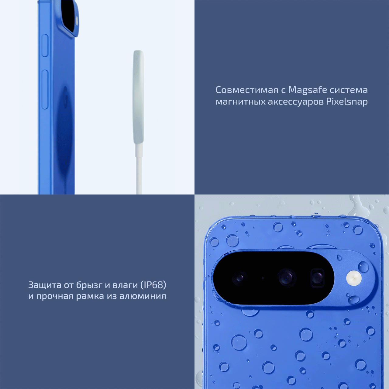 Pixel 10 работает целый день на одном заряде, а в режиме энергосбережения способен проработать гораздо дольше. Поддерживается быстрая проводная (до 55% за полчаса) и беспроводная зарядка, а благодаря Pixelsnap смартфон легко использовать с магнитными держателями, беспроводными зарядками и аккумуляторами-рюкзачками, а также с другими аксессуарами, в том числе MagSafe.