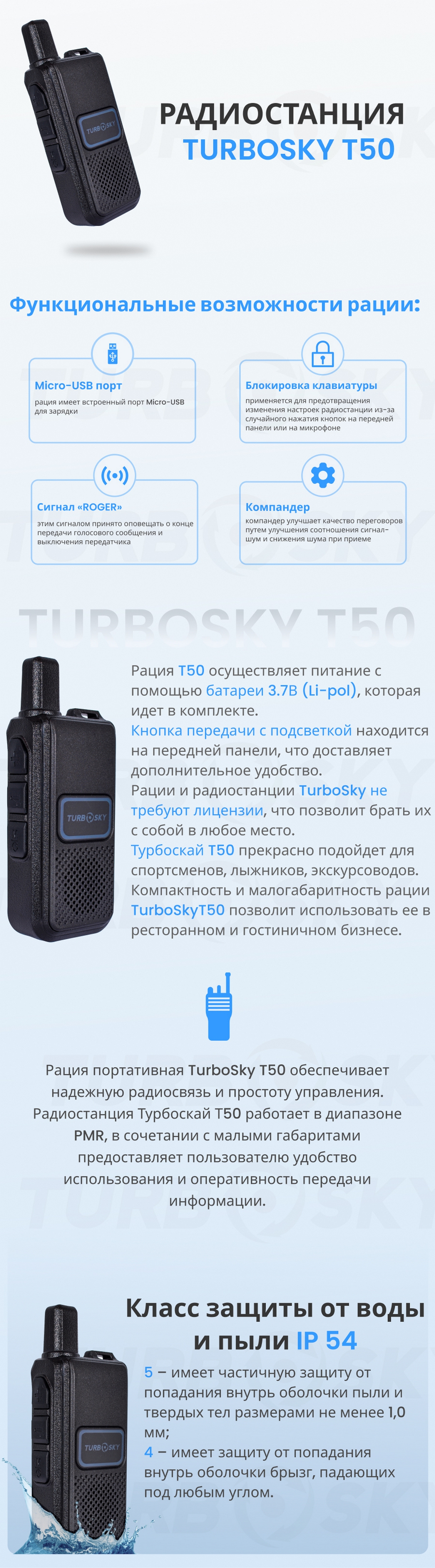 Рация T50 осуществляет питание с помощью батареи 3.7В (Li-pol), которая идет в комплекте. Кнопка передачи с подсветкой находится на передней панели, что доставляет дополнительное удобство. Турбоскай T50 прекрасно подойдет для спортсменов, лыжников, экскурсоводов. Компактность и малогабаритность рации TurboSkyT50 позволит использовать ее в ресторанном и гостиничном бизнесе.