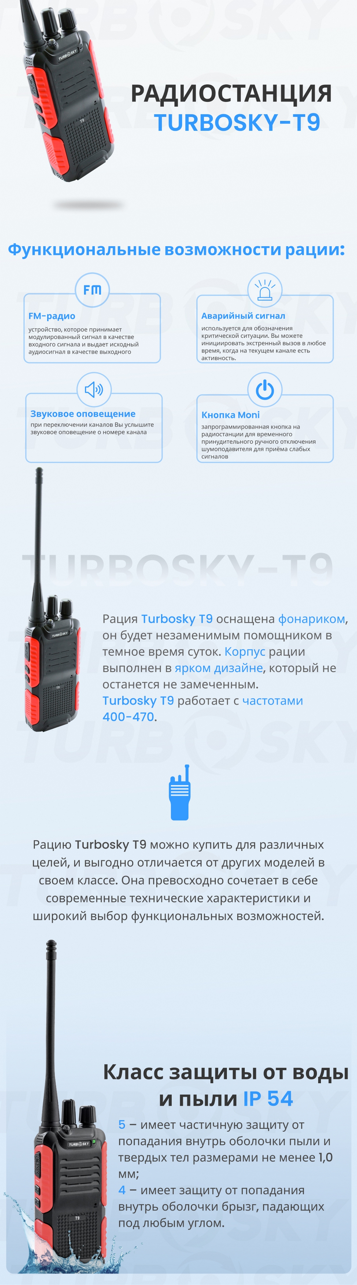 Рацию Turbosky T9 можно купить для различных целей, и выгодно отличается от других моделей в своем классе. Она превосходно сочетает в себе современные технические характеристики и широкий выбор функциональных возможностей.