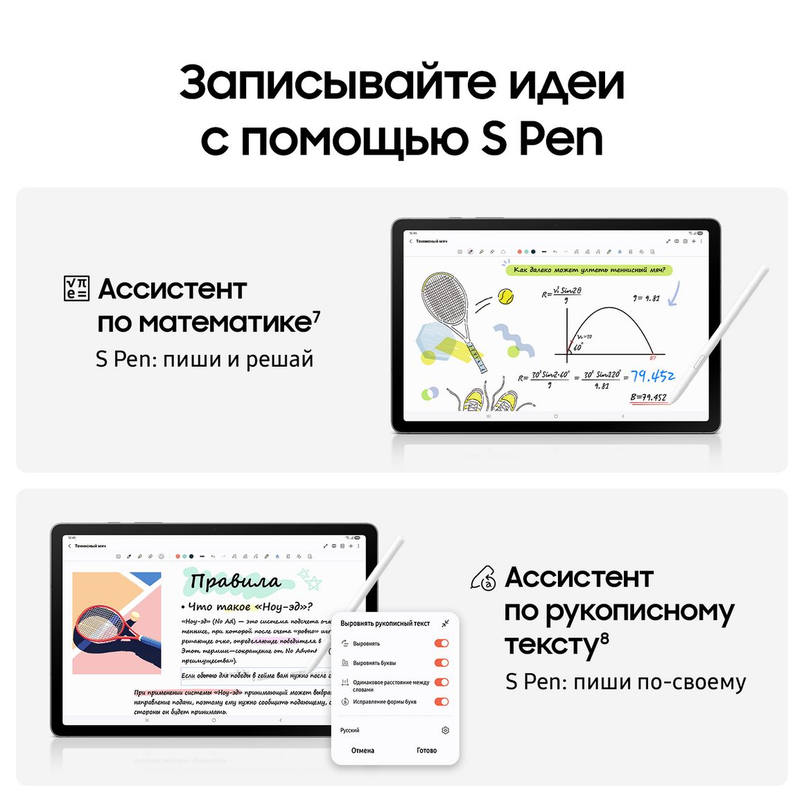 Запишите сложное математическое выражение с помощью электронного пера S Pen, и функция «Ассистент по математике» автоматически решит его за вас. Функция «Ассистент по рукописному тексту» позволяет быстро выравнивать почерк в наспех сделанной от руки заметке, чтобы она выглядела аккуратно. Вы можете мгновенно выпрямить неровный наклон, сделать интервалы между словами и буквами одинаковыми, выровнять буквы и исправить их форму.