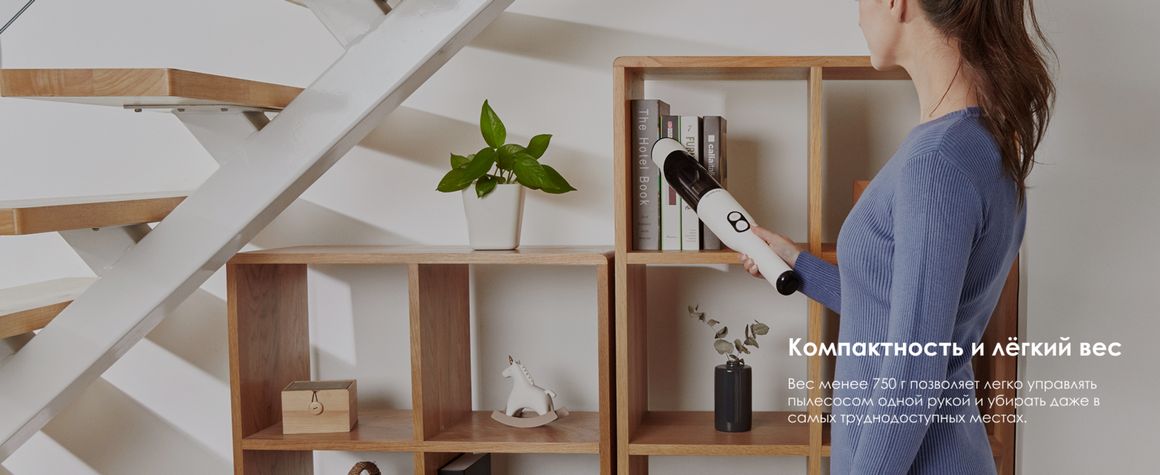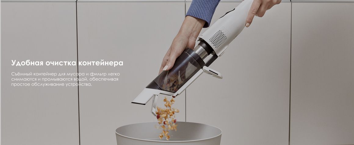 Пылесос отличается лёгким весом и сбалансированной конструкцией, поэтому им удобно пользоваться даже одной рукой. Съёмный контейнер для мусора и фильтр легко очищаются и промываются водой, упрощая обслуживание устройства.
