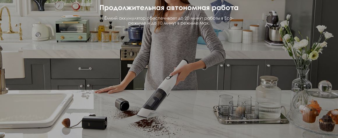 Благодаря ёмкому аккумулятору Go Mini Pet работает до 20 минут в Eco-режиме и до 10 минут в режиме Max, обеспечивая достаточное время для быстрой уборки дома или автомобиля.