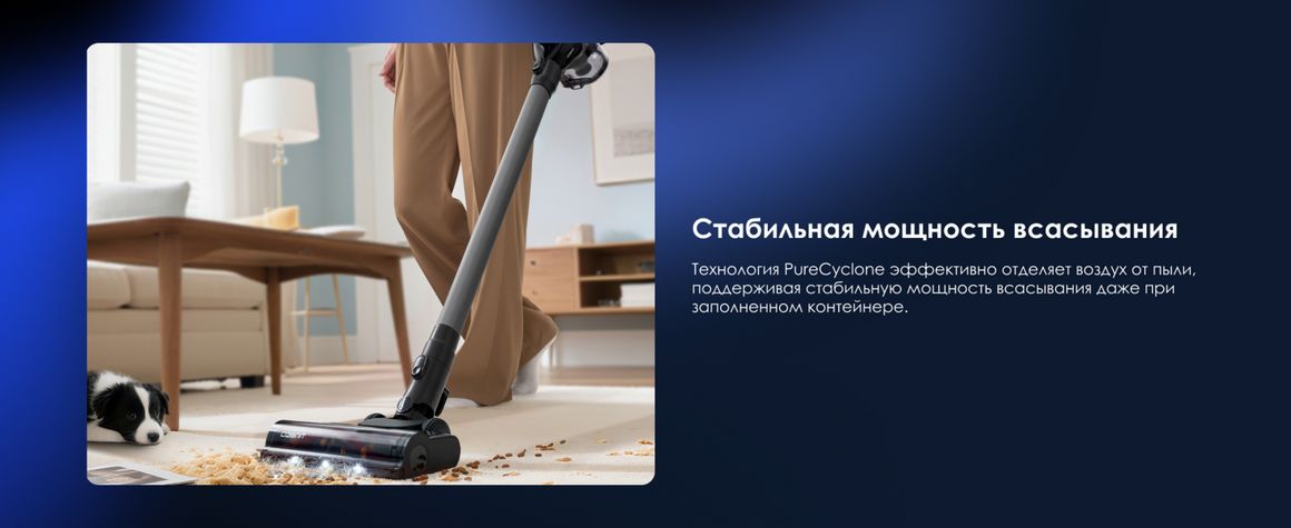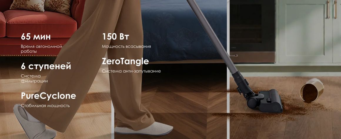 Доступный и эффективный беспроводной пылесос с мощностью 150 Вт, системой анти-запутывания ZeroTangle и технологией PureCyclone для стабильной мощности всасывания. Обеспечивает длительное время автономной работы и эффективную уборку твёрдых полов и ковров. До 65 минут автономной работы позволяют легко справляться с уборкой всего дома.