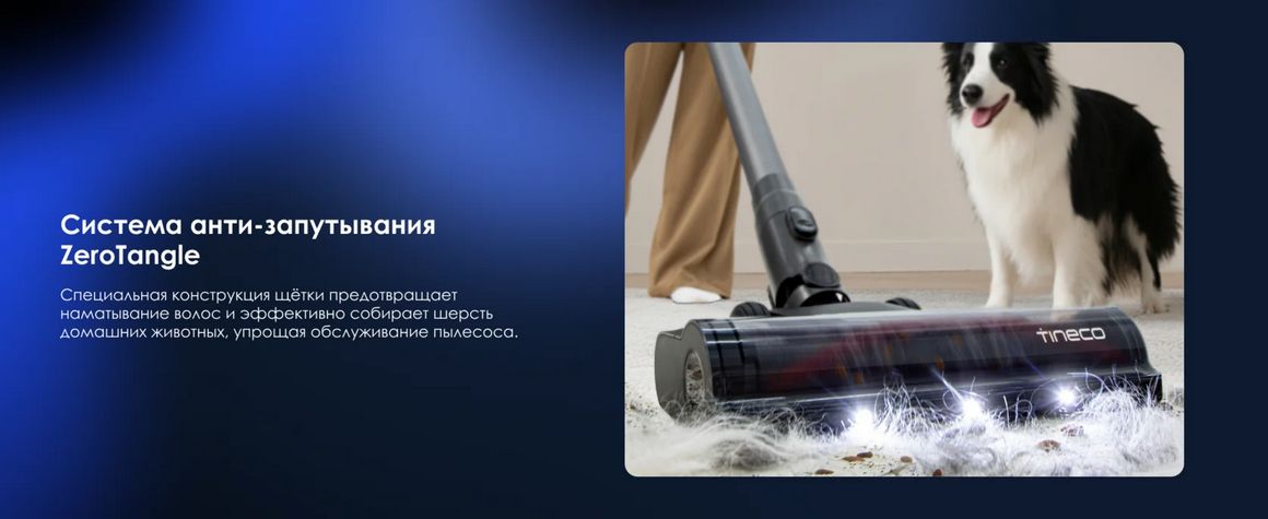 Система ZeroTangle предотвращает наматывание волос на валик щётки, облегчая обслуживание пылесоса и поддерживая высокую эффективность уборки. Благодаря продуманной конструкции устройство легко справляется с шерстью домашних животных и длинными волосами.
