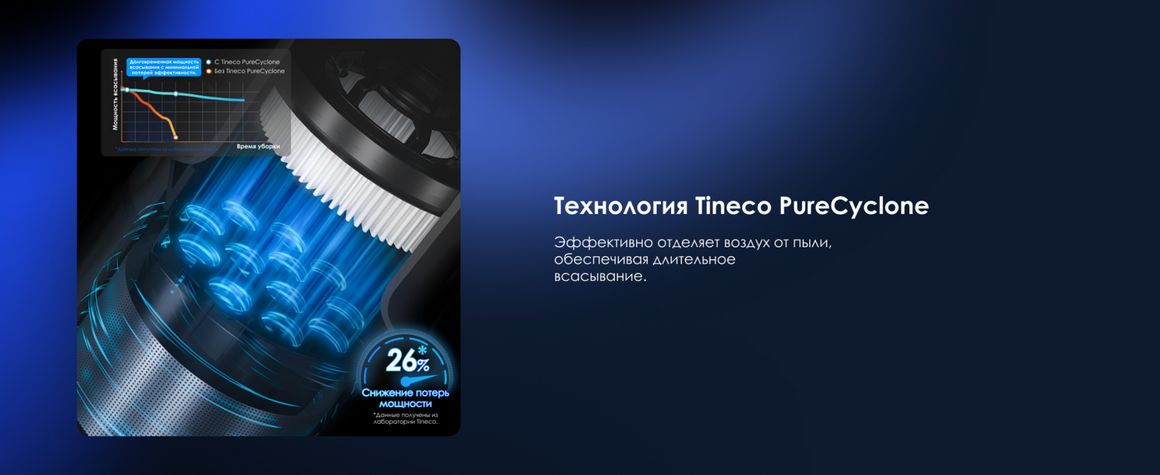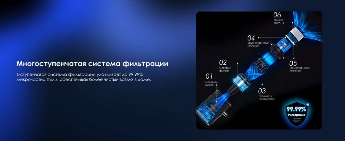 Технология PureCyclone эффективно отделяет воздух от пыли, поддерживая стабильную мощность всасывания даже при заполненном контейнере. В сочетании с 6-ступенчатой системой фильтрации она улавливает до 99,99% микрочастиц, обеспечивая более чистый воздух в помещении.
