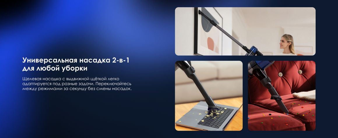 Пылесос также отличается длительным временем автономной работы: до 65 минут в эко-режиме с насадкой «2-в-1» и до 45 минут с щёткой ZeroTangle, что позволяет легко убирать большие площади без подзарядки.