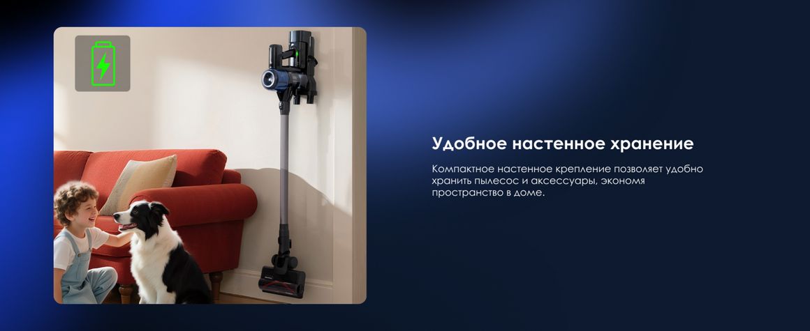Для удобства хранения устройство оснащено настенным креплением, благодаря которому пылесос и аксессуары всегда находятся под рукой и занимают минимум места.