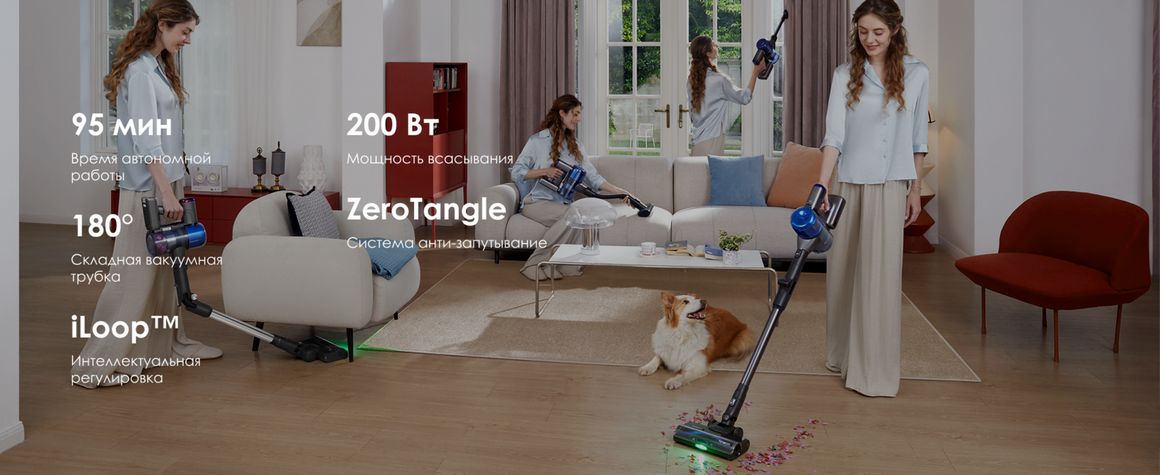 Беспроводной пылесос с мощностью 200 Вт и интеллектуальной системой iLoop Smart, которая автоматически регулирует мощность всасывания в зависимости от уровня загрязнения. Оснащён щёткой 3DSense Pro, системой анти-запутывания ZeroTangle и многоступенчатой фильтрацией для эффективной уборки твёрдых полов и ковров. До 95 минут автономной работы позволяют легко справляться с уборкой всего дома.