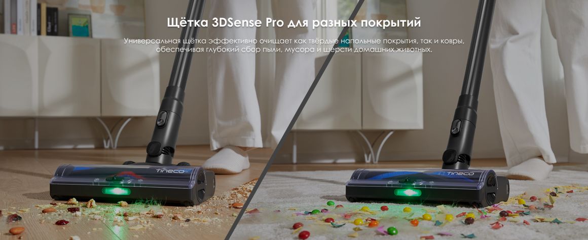 Модернизированная щётка 3DSense Pro Power Brush подходит как для твёрдых напольных покрытий, так и для ковров. Специальная конструкция эффективно собирает пыль, мусор и шерсть домашних животных, обеспечивая глубокую очистку различных поверхностей.