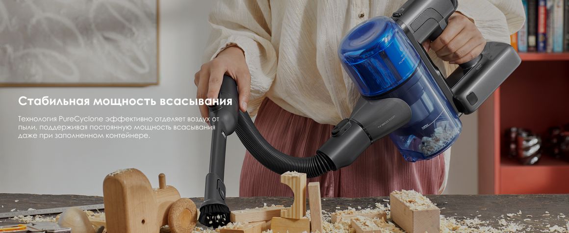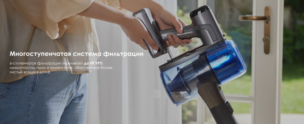 Технология PureCyclone и 6-ступенчатая система фильтрации отделяют воздух от пыли и задерживают до 99,99 % микрочастиц, поддерживая стабильную мощность всасывания и обеспечивая более чистый воздух в помещении.