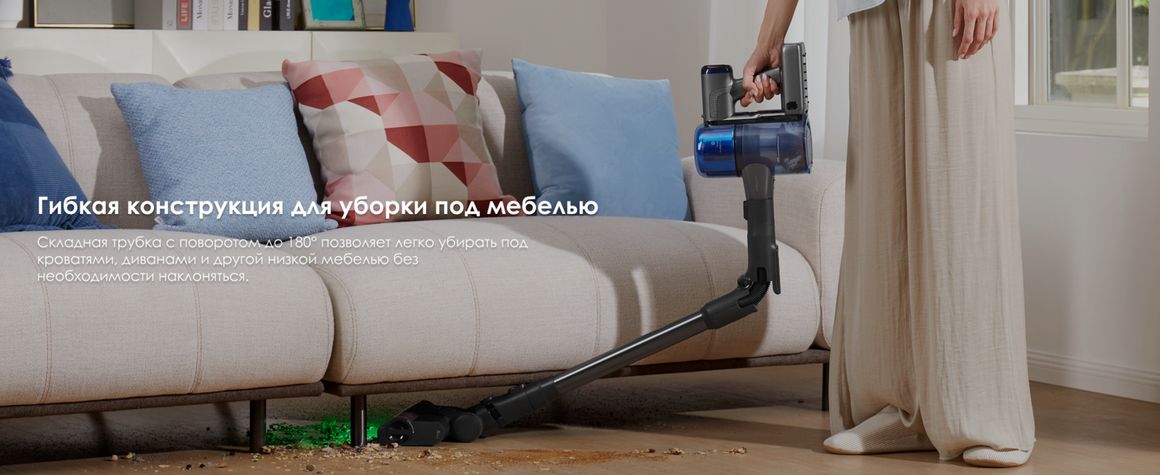 Складная трубка с поворотом на 180° облегчает уборку под мебелью и в труднодоступных местах без необходимости наклоняться.
